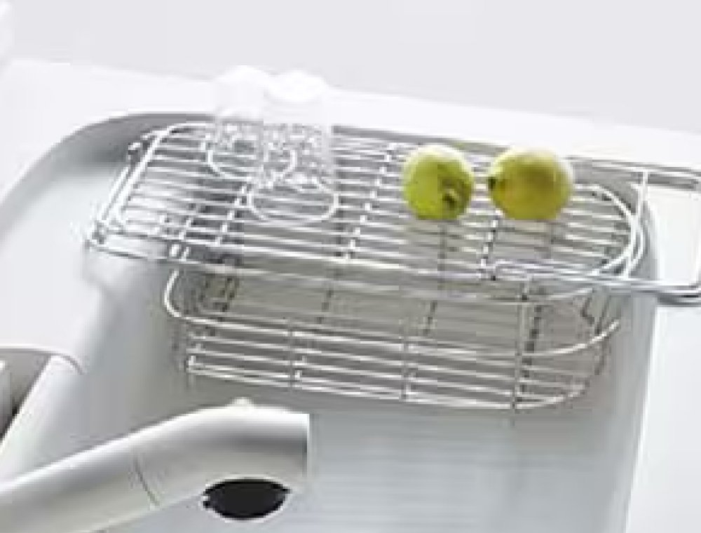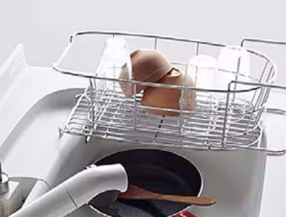 調理スペースを広げるサポートワイヤーと、 野菜や食器等の仮置きに水切りカゴをご用意。