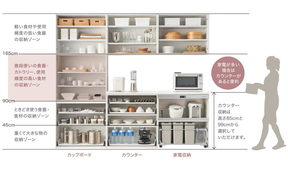 サイズや棚位置をカスタマイズできるので、お好みの 収納に仕上がります。