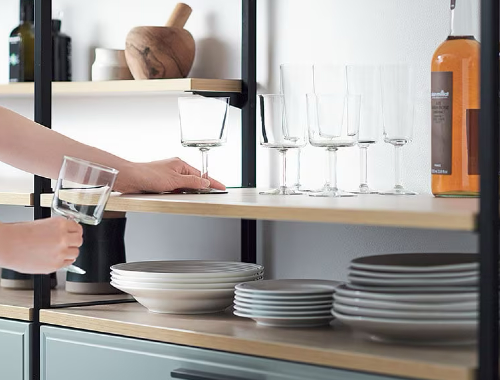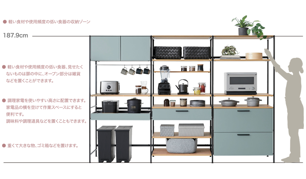 扉や引出しを開け閉め必要がなく、必要なモノが 必要なときにすぐにサッと使えます。