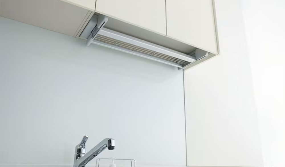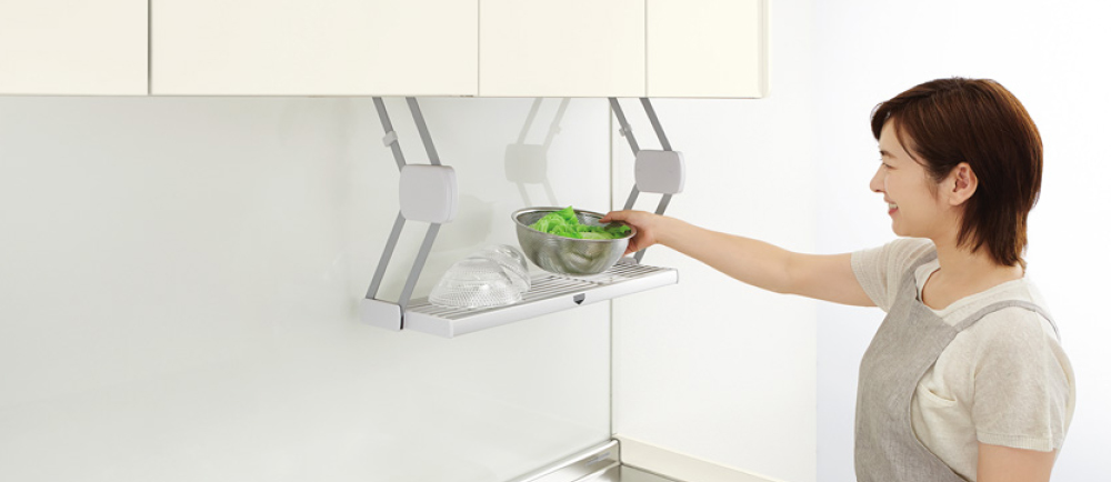 スイッチひとつで棚が垂直に昇降します。調味料などが目の高さで出し入れ でき、調理中も降ろしたまま使えて便利です。