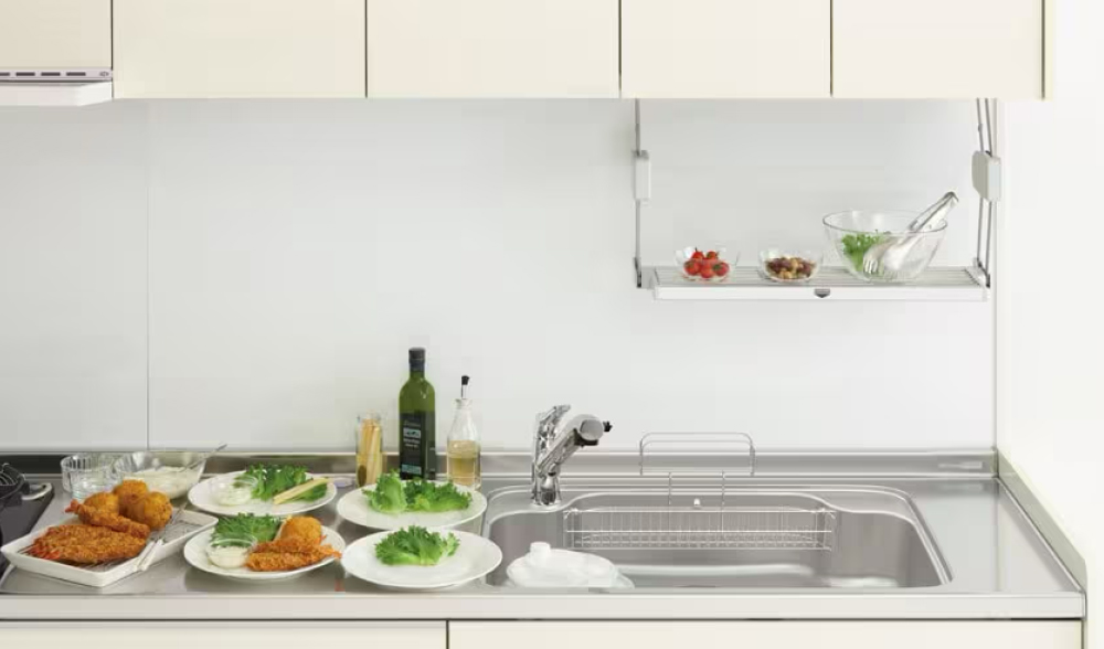 調理や盛り付けの作業スペースが足りなくなった時に、サッと下ろして仮置きできます。棚はワイヤー製なので水切りとしても使えます。