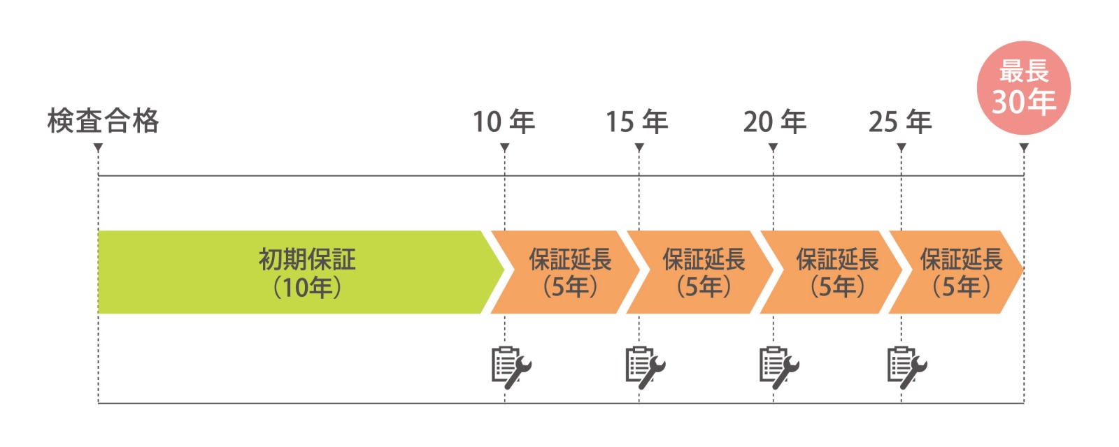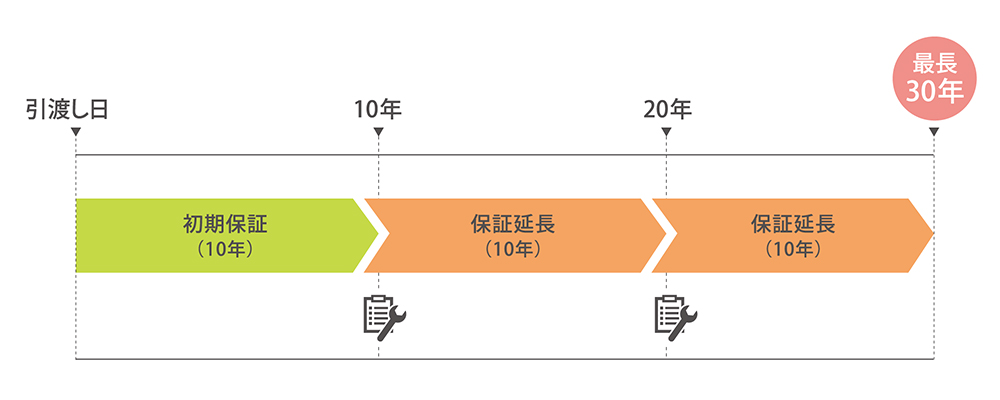 最長30年※延長をご希望の場合は、点検(無償)が必要です。また、不具合が見つかった場合はメンテナンス(別途費用)が必要となります。