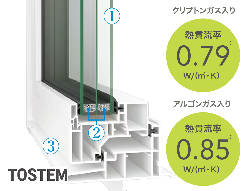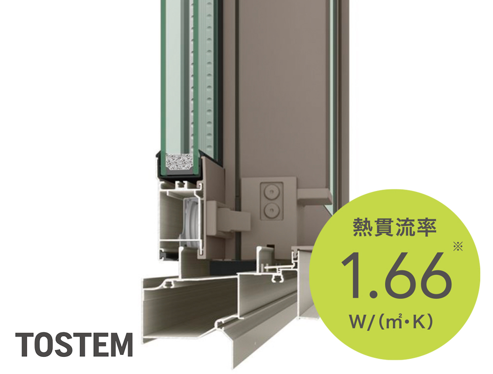 室内側と室外側にLow-Eガラスを採用し、中空層には熱伝導率が低いクリプトンガス/アルゴンガスを封入。さらに、トリプルガラスの中間ガラスに1.3㎜の特殊薄板ガラスを採用し、断熱性と軽さを両立しました。