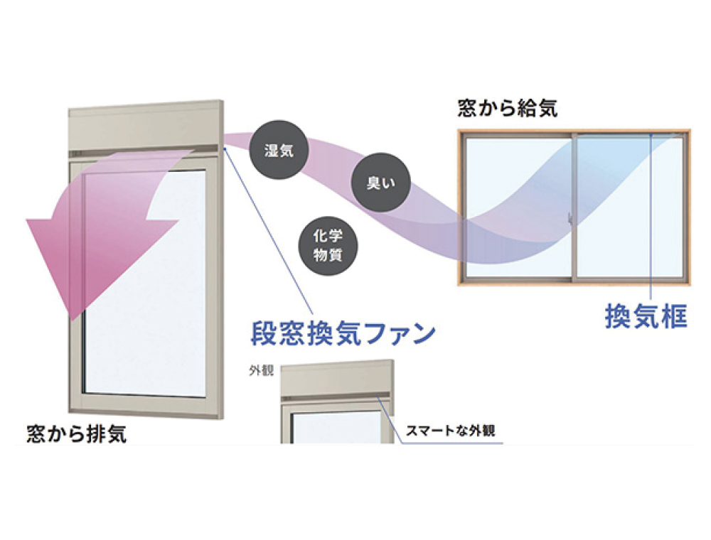 壁に穴を開けずに、段窓換気ファンと換気框の組合せで24時間換気ができます。
