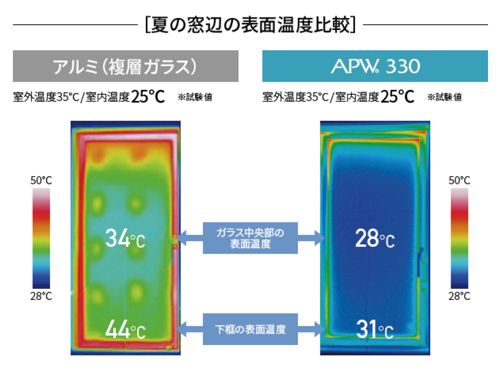 樹脂窓は、室温を上げる日射熱をブロックします。そのため、室内側のフレームとガラスの温度は、従来の窓のように高温になることもなく、室内温度が快適に保たれるのです。夏の窓辺の表面温度は、窓でこんなにも変わります。