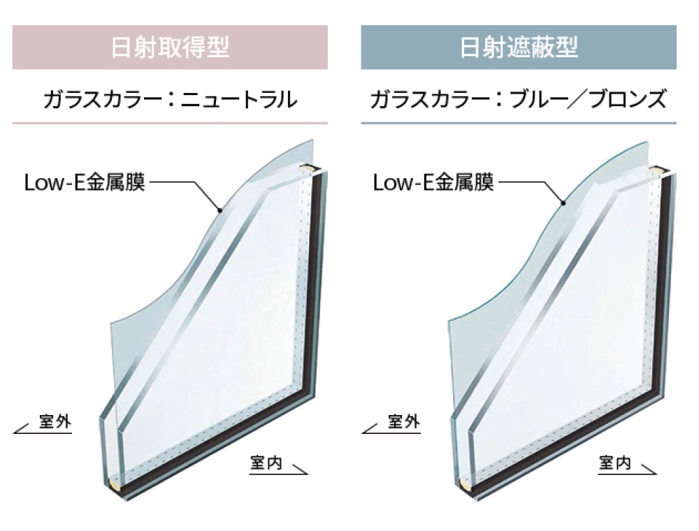 2タイプの Low-E 複層ガラスをラインアップ。冬場に太陽の暖かさを取込みたい南向きの部屋には“日射取得型” のガラス、厳しい西日が差込む部屋には“日射遮蔽型” といった使い分けができます。
