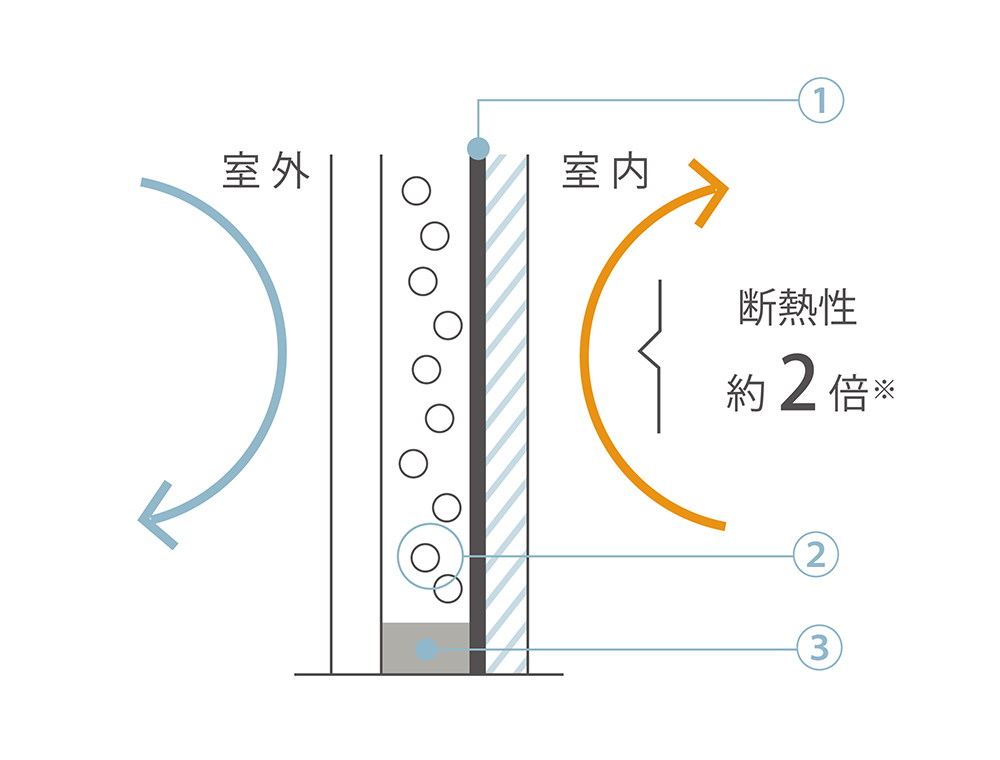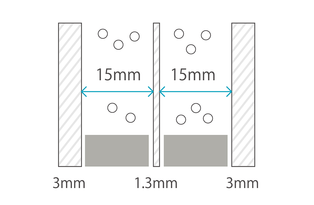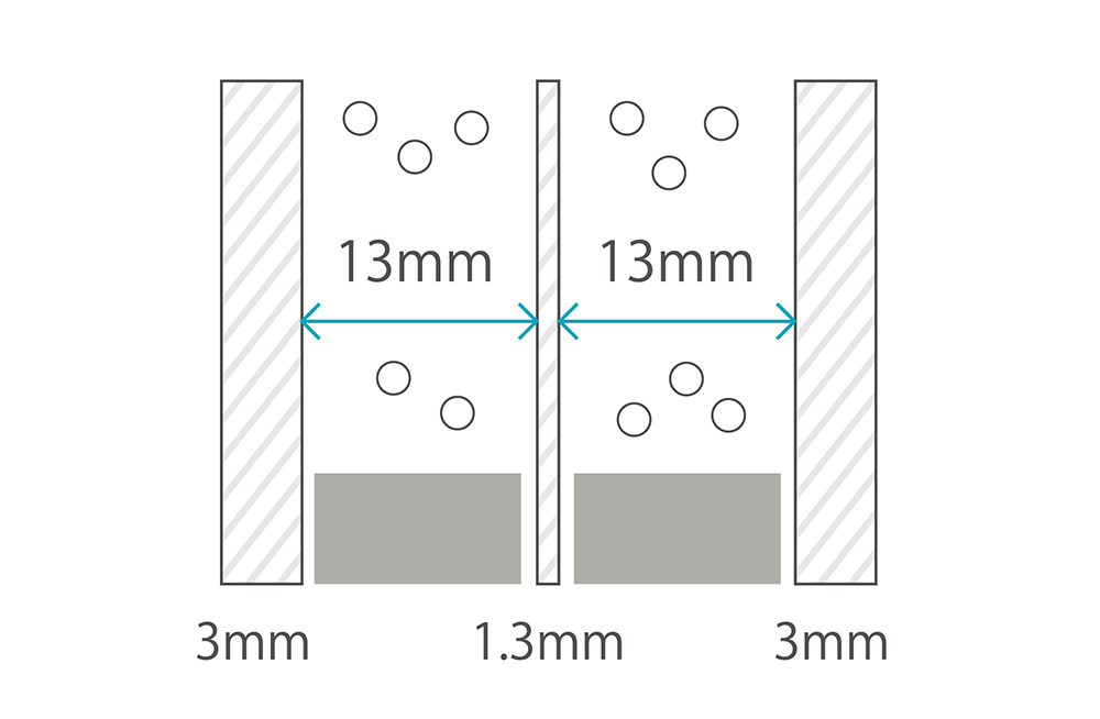 空気に比べ熱の伝わりを 約30%抑制。 中空層は高い断熱効果を 発揮する15~16mm※3 に設計。
