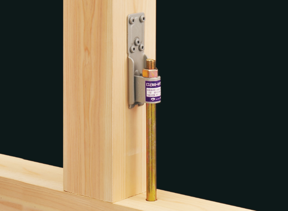 柱が地震の際の上下の揺れで特に基礎から引き抜かれる(引き抜き力)のを防ぐために使われる、重要な耐震金物です。