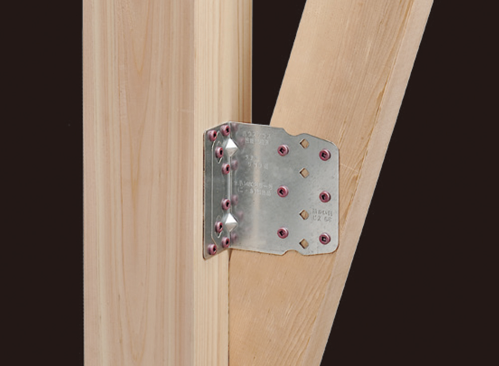 柱と斜め材(筋交い)を接合する金物。地震などで建物に横から力が加わったときに、柱と筋交いがズレたり、外れないように支える重要な金物。
