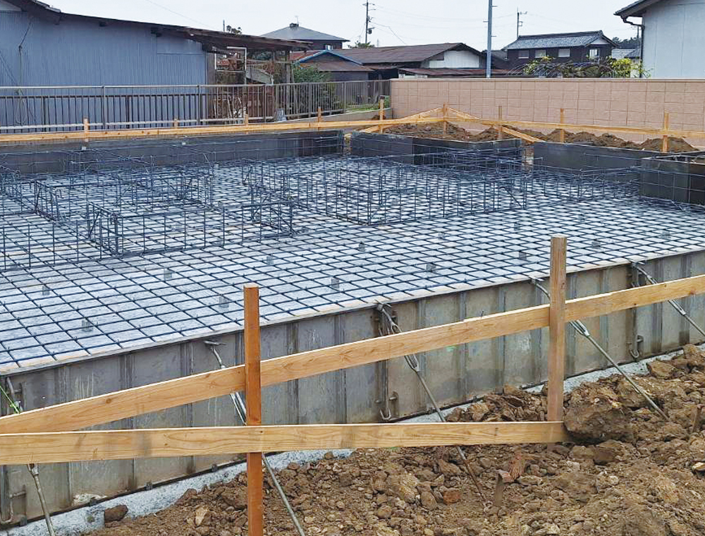コンクリートだけでは引っ張る力に弱く、ひび割れが起きやすいため、鉄筋を内部に入れることで、地震や地盤の揺れにも耐えられる、強い構造の頑丈な基礎をつくります。