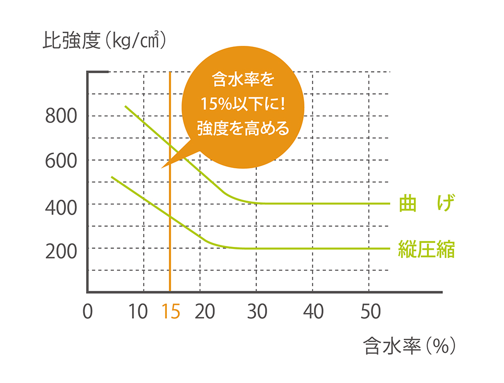 木は水分を含むと膨らみ、乾燥すると縮む性質のため、建築に使用する木材は水分量(含水率)を適切に管理することが重要です。