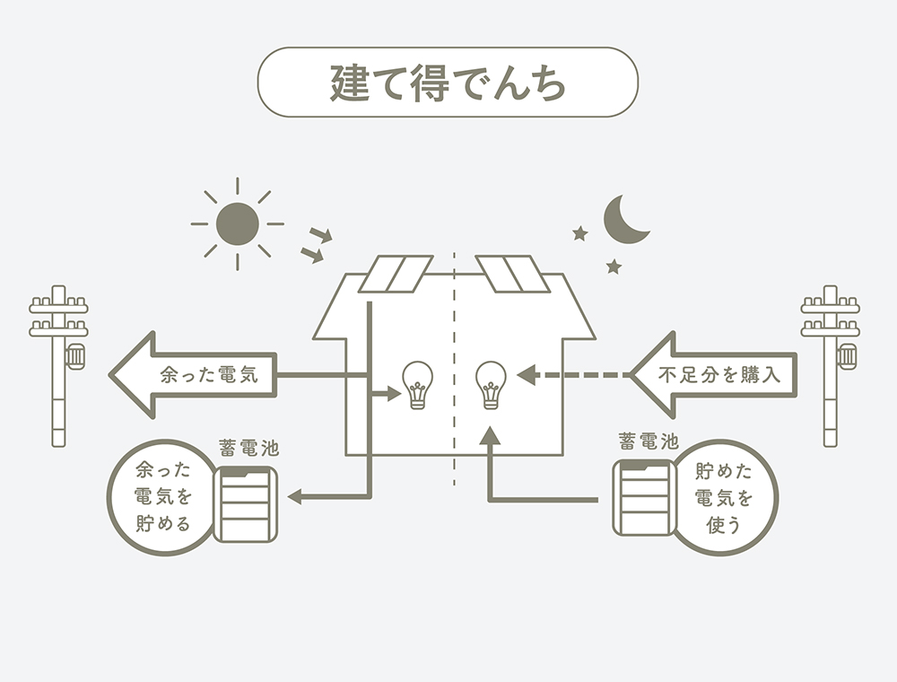 太陽光発電システムで発電した電気を使用しながら余った電気を大容量蓄電池に貯められる「建て得でんち」もちろん、その電気を夜間に使用することも可能です。